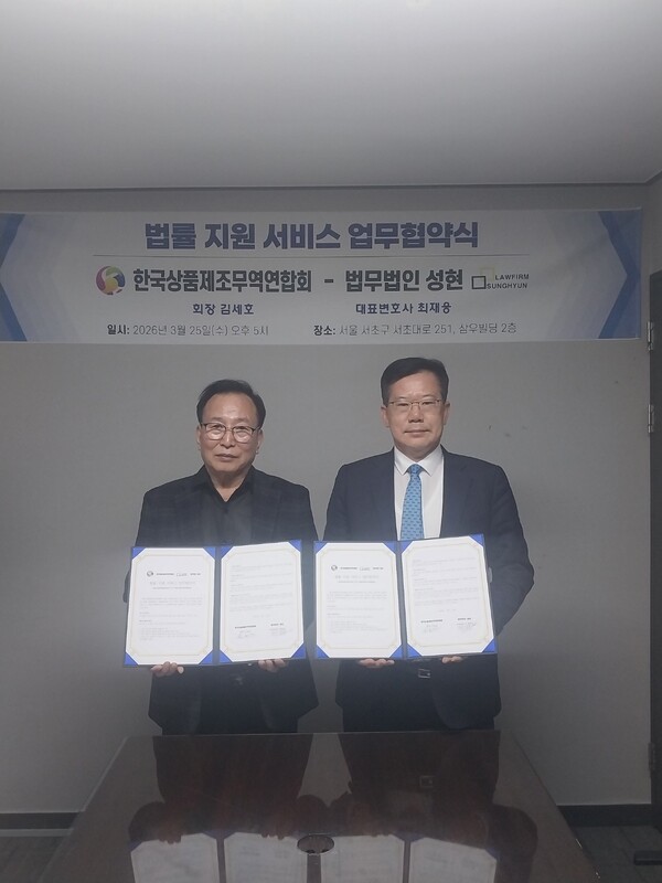[기업뉴스TV=권순 기자] 법무법인 성현 최재웅 대표변호사가 지난 25일 법무법인 성현 사무실에서 한국상품제조무역연합회와 법률지원 서비스 업무협약을 체결했다.